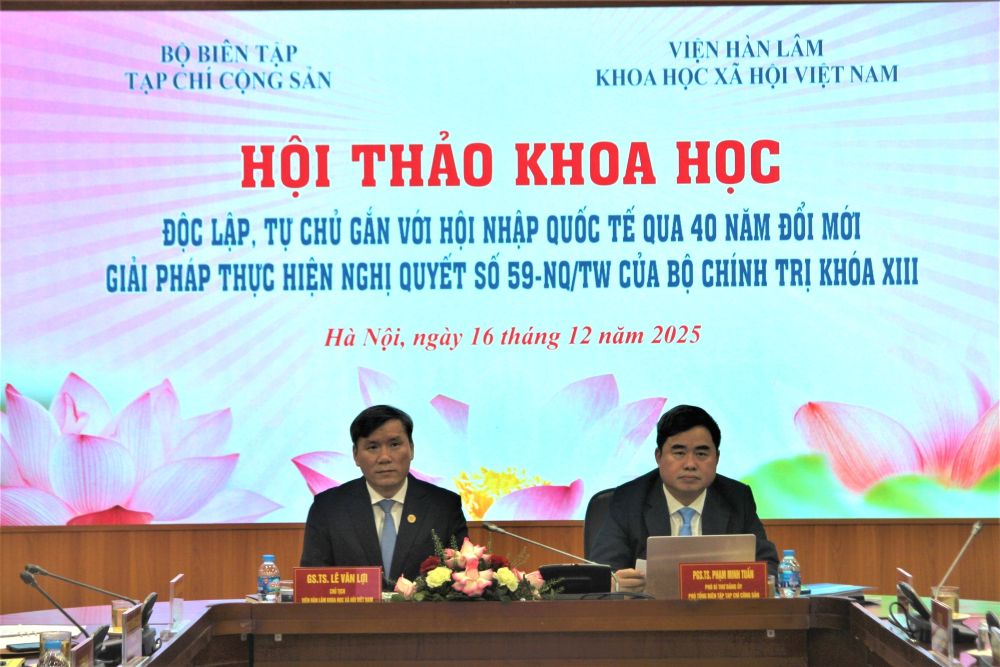 Ngày 16-12-2025, Bộ Biên tập Tạp chí Cộng sản phối hợp với Viện Hàn lâm Khoa học xã hội Việt Nam tổ chức Hội thảo khoa học: “Độc lập, tự chủ gắn với hội nhập quốc tế qua 40 năm đổi mới: Giải pháp thực hiện Nghị quyết số 59-NQ/TW của Bộ Chính trị khóa XIII”. Hội thảo làm rõ những vấn đề lý luận về mối quan hệ giữa độc lập, tự chủ và hội nhập quốc tế; đồng thời tổng kết thực tiễn về bảo đảm độc lập, tự chủ và hội nhập quốc tế của Việt Nam qua 40 năm, qua đó đúc rút bài học kinh nghiệm và đề xuất giải pháp trong giai đoạn mới của đất nước theo tinh thần Nghị quyết số 59-NQ/TW, ngày 24-1-2025, của Bộ Chính trị khóa XIII, “Về hội nhập quốc tế trong tình hình mới”.