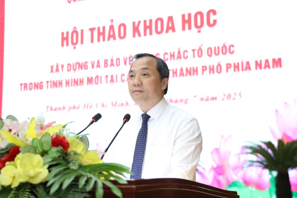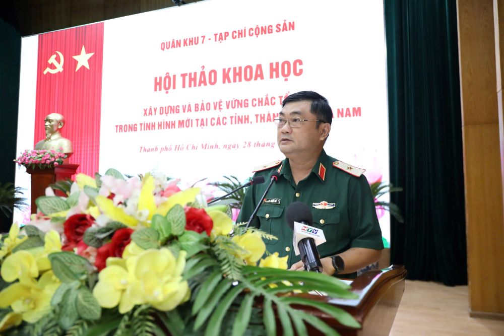 Phát biểu chào mừng hội thảo, đồng chí Thiếu tướng Trần Vinh Ngọc, Bí thư Đảng ủy, Chính ủy Quân khu 7 nhấn mạnh: Trong không khí thiêng liêng và đầy ý nghĩa nhân kỷ niệm 78 năm Ngày Thương binh - Liệt sĩ (27-7-1947 - 27-7-2025), dịp để toàn Đảng, toàn dân và toàn quân thể hiện lòng tri ân sâu sắc đối với các anh hùng liệt sĩ, thương binh, bệnh binh, những người đã hy sinh, cống hiến vì độc lập, tự do của dân tộc, vì sự bình yên của Tổ quốc; cũng là thời điểm tổ chức đại hội đảng bộ các cấp, tiến tới Đại hội XIV của Đảng - sự kiện chính trị trọng đại, định hướng cho kỷ nguyên vươn mình của dân tộc Việt Nam, do đó, việc tổ chức hội thảo với chủ đề “Xây dựng và bảo vệ vững chắc Tổ quốc trong tình hình mới tại các tỉnh, thành phố phía Nam” mang ý nghĩa quan trọng.